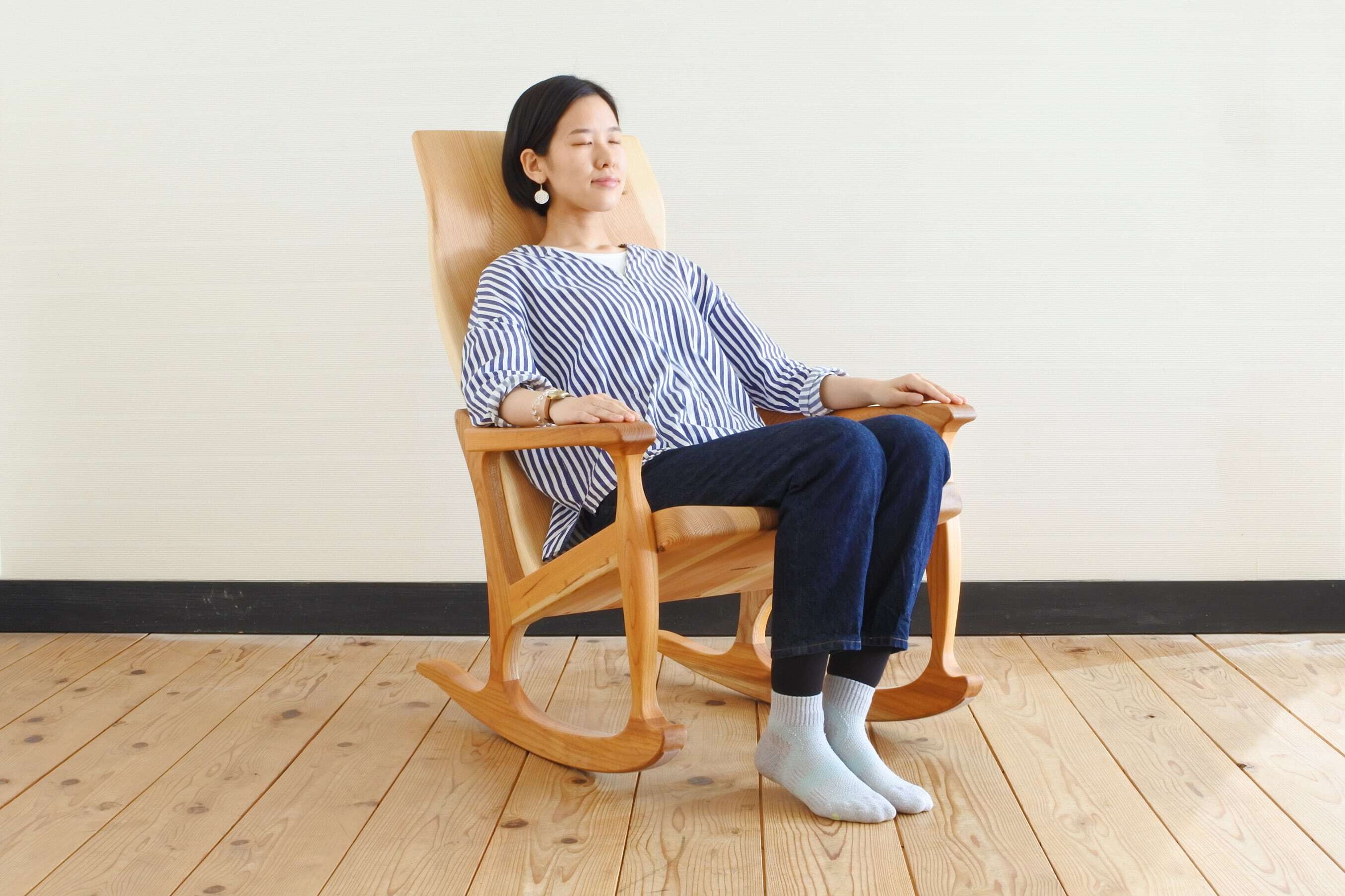 ふくよかで、丸みのあるデザイン。紀州スギの木の良さを引き出しつつ、座る人の心地よさを追求すると、自然と出来上がったこの愛らしいフォルム。分厚く切り取った背もたれや、体にフィットする曲線は、紀州スギだからこそ出来るデザインです。