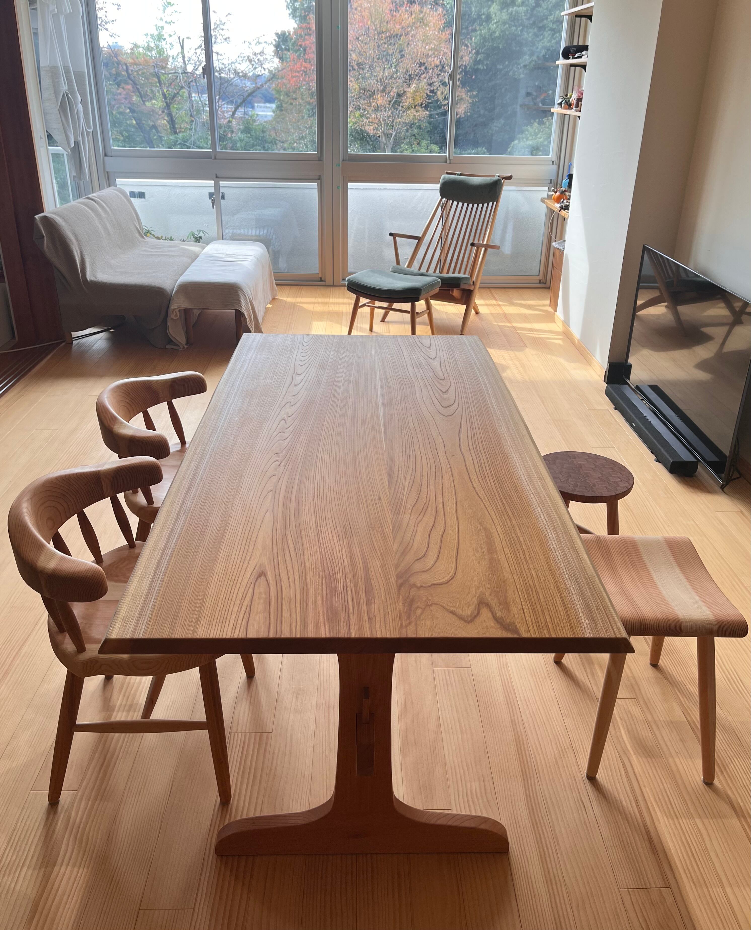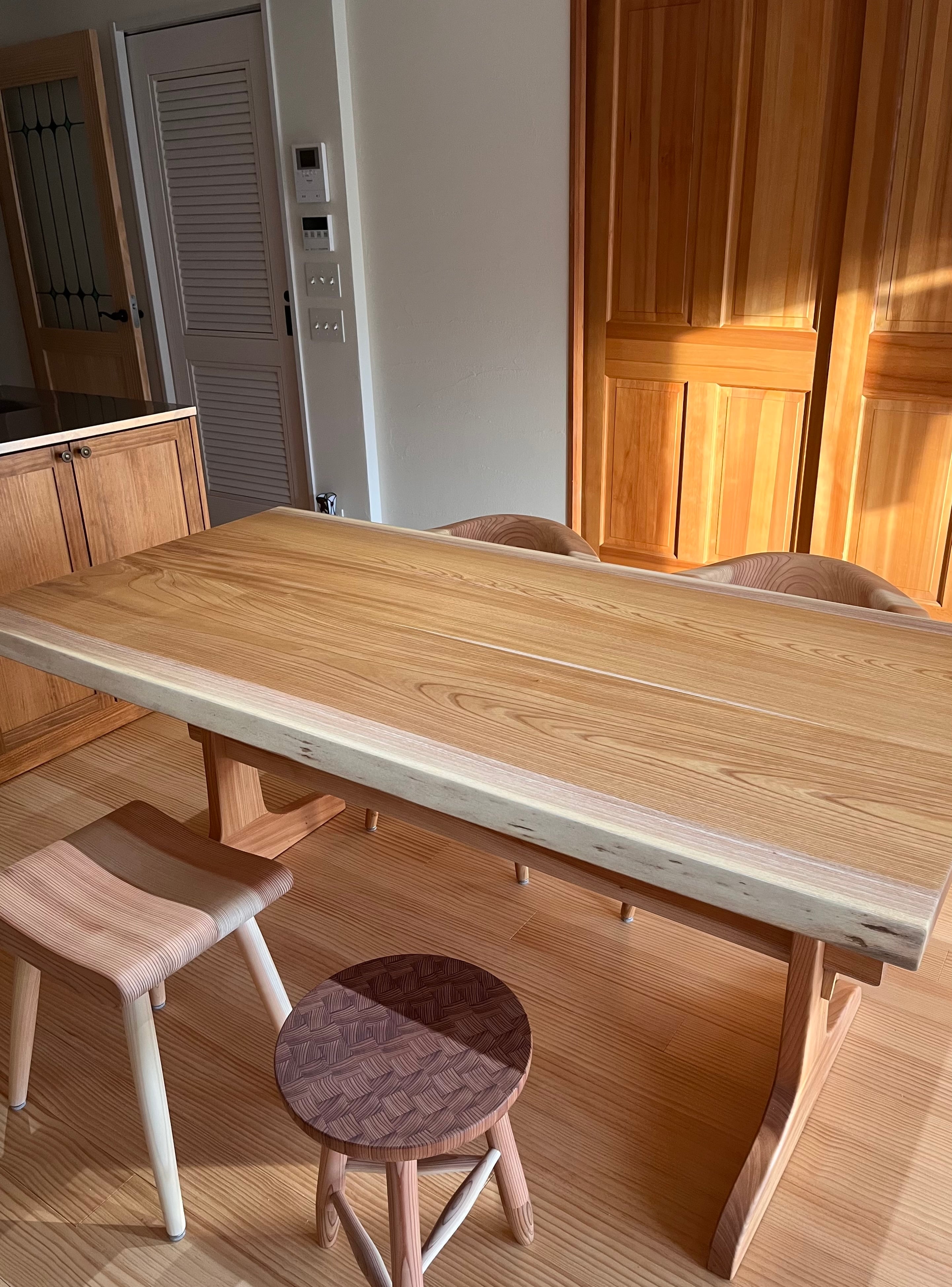 〇本日予定通りケヤキのダイニングテーブルが到着いたしました。見事なテーブルに感動しております。ほんと美しいですねー。食事の時間を楽しみたいと思います。材質_ケヤキ・脚タイプ_板脚(2025.12.6)